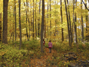 The half-mile blue trail is perfect for both young and old, as it is shorter and easy to navigate. The red trail is 1.2 miles long and a little more challenging. Visitors can easily walk the red and blue trails for a pleasant 1.7-mile hike under a canopy of brilliant autumn leaves.
