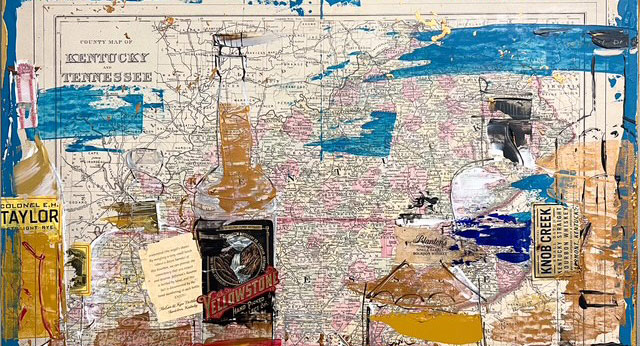 Today, Randy’s studio reflects both his inner world and his outer adventures. His work — layered, bold and emotive — is not just abstract. It’s personal. Vintage sheet music, historic 1850s maps, sand from beloved beaches and, yes, even a splash of bourbon or ocean water — his paintings are tactile journals of the places and passions that have shaped him.