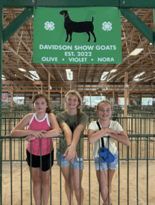 The Davidson sisters — Olive, Violet and Nora, daughters of Luke and Amy Davidson — earned top honors during fair week. Violet placed grand champion in the Pygmy Doe Show, and Nora won the Junior Dairy Goat Showman award.
