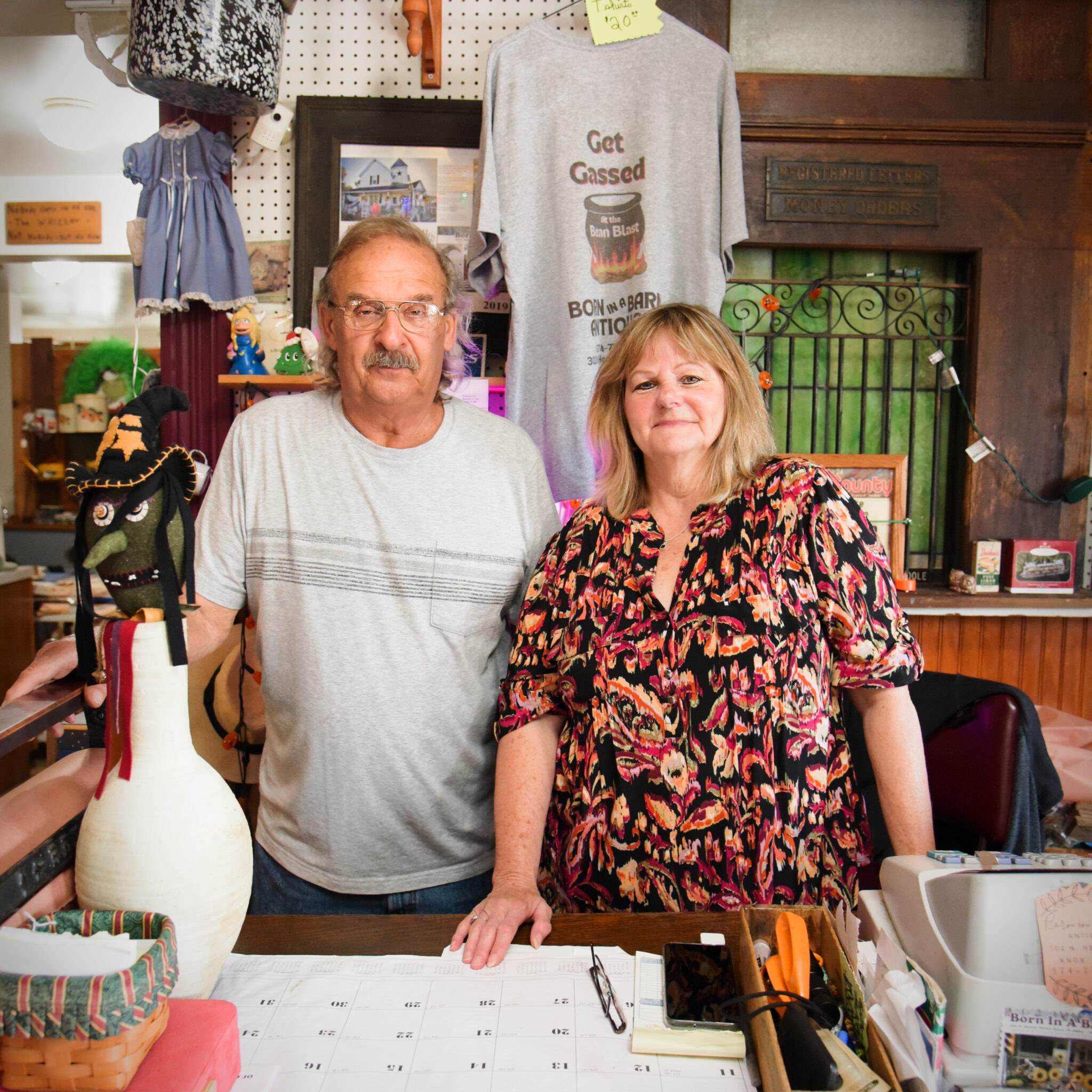 After their joyous union in marriage, they continued as a business team at antique malls, flea markets, and estate sales before deciding to open a shop of their own. When a rental property they owned became vacant, they united again to remodel it into a storefront home for Born in a Barn. Their current advertisement reads, “Not only do we have antiques…we have old stuff, new stuff, barn stars, candles, costume jewelry, furniture, collectibles, vintage toys, Fannie May candy, jellies, fresh honey, and don’t forget some plain-old, downright ugly stuff too!”