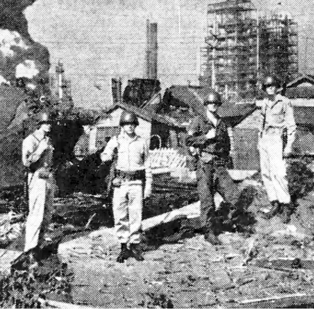 In the early morning hours of August 27, night workers at the refinery had been trying to restart a fluid hydroformer; instead, an explosion destroyed the 26-story “cracking” unit (believed to be the largest in the world at the time), creating an 8,000-foot mushroom cloud that obscured the sun, and smoke visible over 60 miles away. The resulting fire burned some four million gallons of high octane gasoline over the next several days, destroying a significant portion of the plant area. Inside the refinery, more than 3,000 workers initially fought to contain the fire.