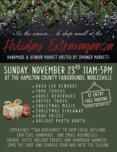 The holidays are quickly approaching, and with the magic of the season comes the challenge of finding gifts family and friends will love. On Sunday, Nov. 23, from 11 a.m. to 5 p.m., Spooner Markets will present the third annual Holiday Extravaganza Market at the Hamilton County Fairgrounds.