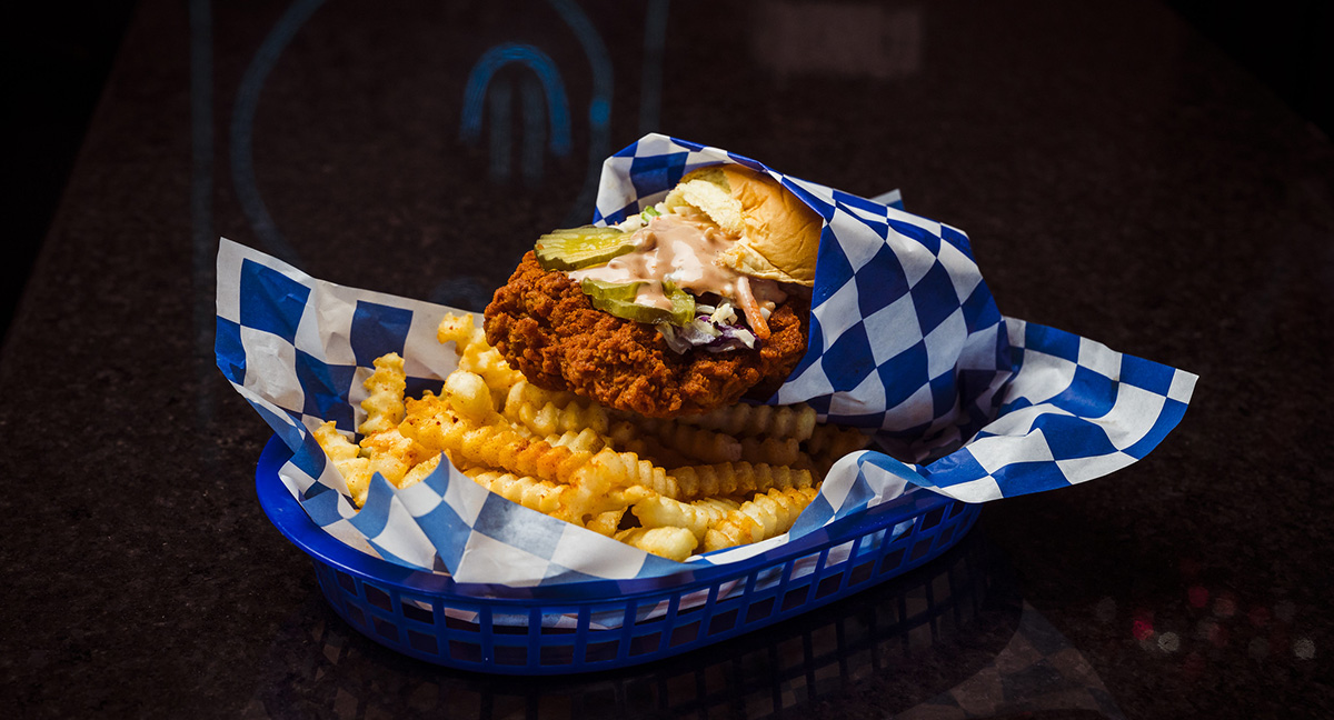 The chicken can be bone-in, tenders, wings or sandwiches, with seven different heat levels and customizable additions. The degree of spice ranges from Southern, which has no spice, to Hot-Hot.