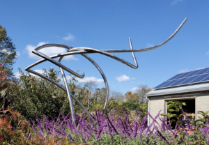 Currently, 18 of Caudill’s stainless steel garden sculptures are on exhibit at Yew Dell Gardens. Compound curves in his sculptures create dynamic movement as the viewer walks around his work. Caudill describes his Yew Dell Gardens collection as rhythmic, like a kind of visual music.