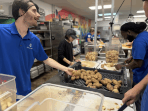“We are an intersection between food rescue and hunger relief,” Kamar says. “On one side is the hospitality industry with an incredible amount of surplus food that is still viable. We have a crazy array that gets donated to us. Our partners are health department-certified, and our chefs are safe food handling experts. The meals produced are 70% from scratch and 30% sourced from catering donations. On the other side are community feeding partners, which include domestic violence shelters, human service agencies and street outreach.”