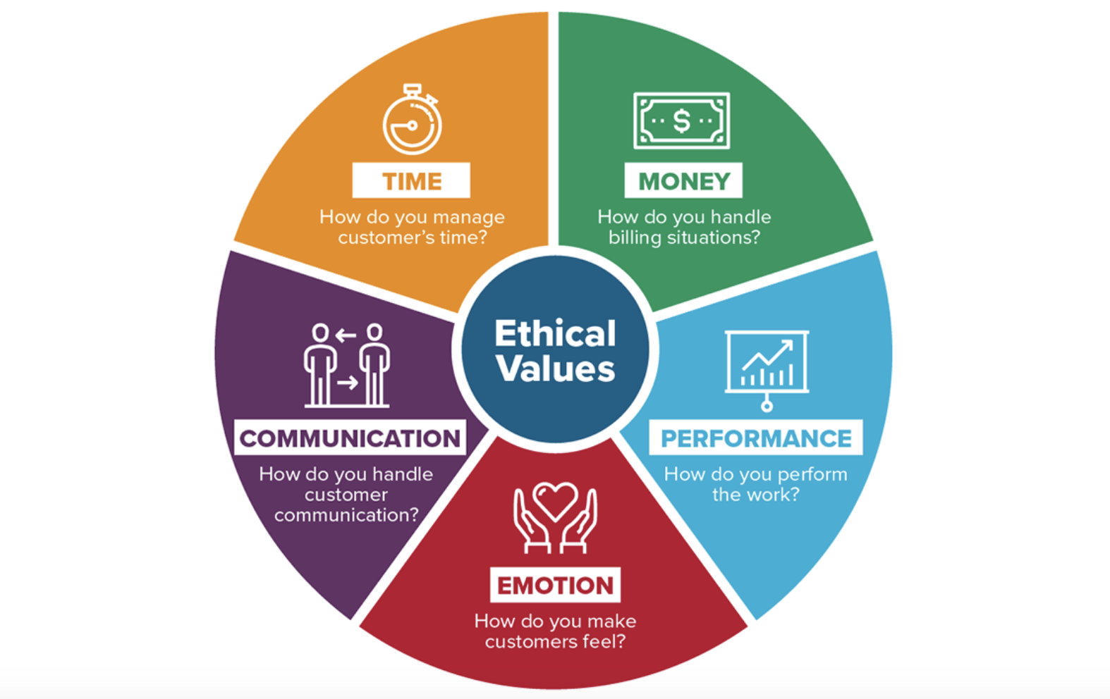 Ethics influence every dimension. At the center of customer experience is whether a business acts in ways that support customer well-being. Ethical lapses can appear as hidden fees (money), unreturned calls (communication), unfinished work (quality), unnecessary delays (time) or disrespectful behavior (emotion). When ethical principles guide decisions, businesses strengthen trust across all five areas.